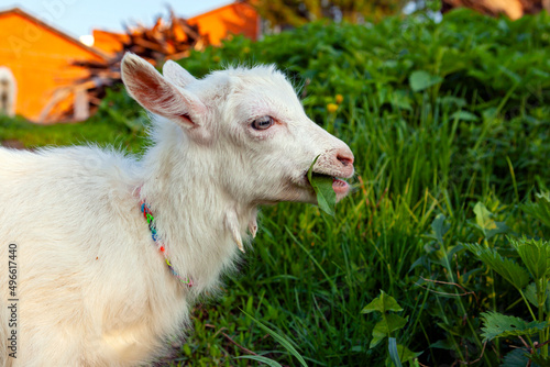 Obraz premium A white goat eats grass in the village.