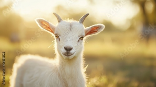 © Luxetify, Fototapeta premium A White Goat Kid with Horns Looking at the Camera