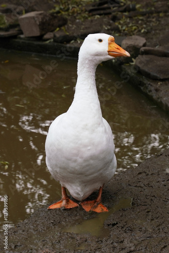 © Sergey, Obraz premium A white goose poses elegantly with its neck extended by a tranquil pond.