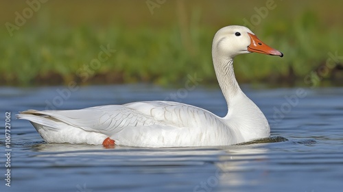 Fototapeta premium A white goose swims in a pond, looking to the right with its neck stretched out.