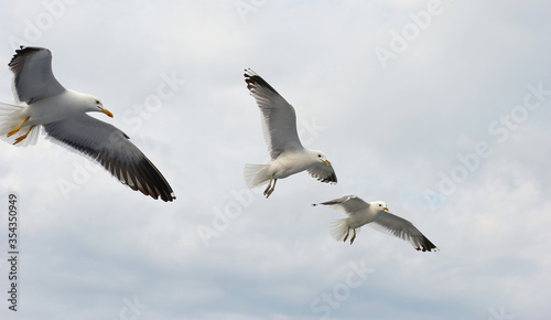 Fototapeta premium A white gull soars in the blue sky, a gull flies