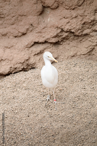 Fototapeta premium A white heron with a sharp yellow beak stands among stones.