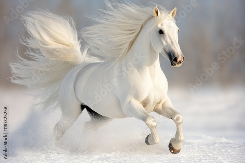 © Sanchai, Fototapeta premium A white horse galloping through a snow-covered field, with its mane flowing in the wind