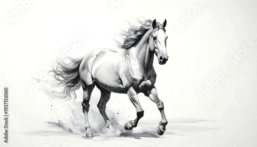 © Dion, Obraz premium A white horse gallops dynamically against a white backdrop, illustrated with intricate shading details