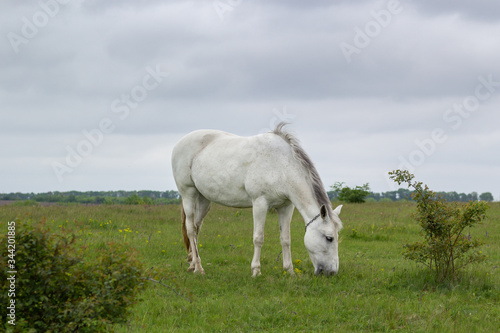 © galilo3981, Fototapeta premium A white horse grazes on a green meadow