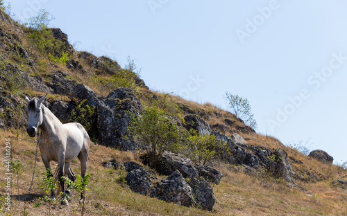 Naklejka premium A white horse in a pasture in the mountains.