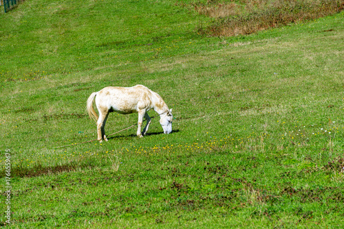 Fototapeta premium A white horse on a rope tether grazes and eats grass in a bright green field...