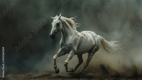 © Musarat, Obraz premium A white horse sprints ahead through dust against a dark backdrop