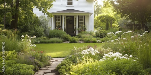 © Iryna, Fototapeta premium A white house with a porch and a path leading to it. The path is lined with flowers and bushes