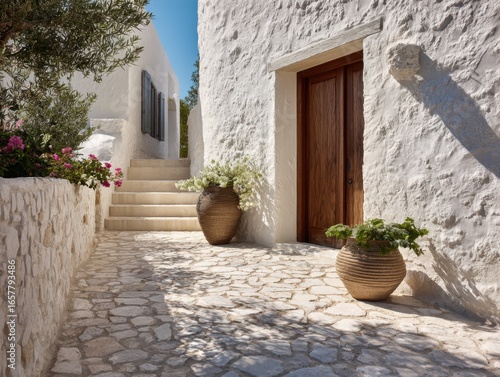 © Bouchra, Naklejka premium A white house with a stone wall and a stone walkway. There are two vases on the walkway, one on the left and one on the right