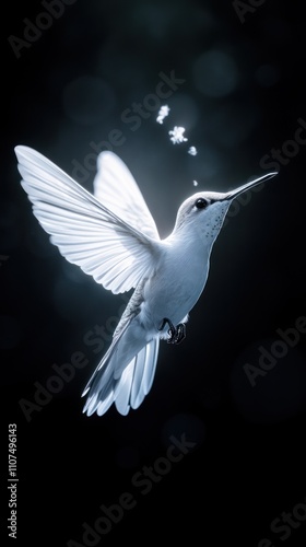 © Umi Sakina, Obraz premium A white hummingbird in flight against a dark background with a light source behind it, creating a halo effect around the bird.