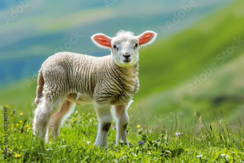 © Evita, Fototapeta premium A White Lamb Standing in a Field of Grass