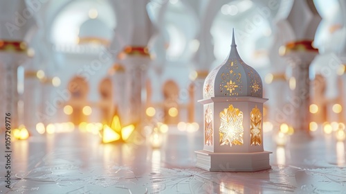 © muhim, Obraz premium A white lantern, lit, sits on a light-colored floor in a beautiful, white mosque-like building.