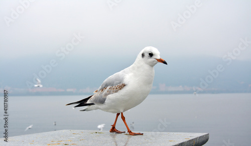© young, Fototapeta premium A white larus ridibundus with colorful wings walking on the platform in the cloudy day