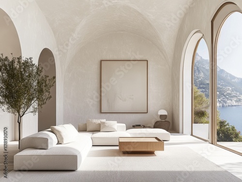 © Bouchra, Fototapeta premium A white living room with a large window and a picture on the wall