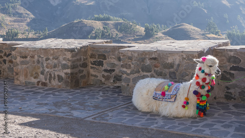© Вера , Obraz premium A white llama lies on a observation deck in the mountains. The animal is beautifully dressed up. Horse blankets, colorful bright pompoms, tassels. Side view. Peru. Colca Canyon