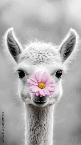© Albert, Obraz premium A white llama with a pink flower in its mouth
