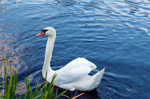 Naklejka premium A white majestic swan floats in front of a wave of water. Young swan in the middle of the water. Drops on a wet head.