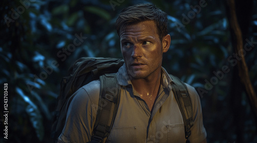 Fototapeta premium A white man in the hiking gear backpack looks lost tried and confused background deep dark jungle