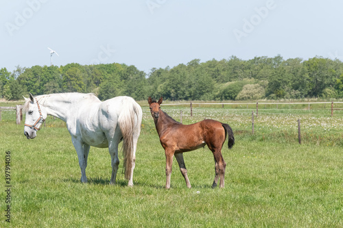 © Dasya - Dasya, Fototapeta premium A white mare with a funny brown foal in the pasture. Country summer landscape