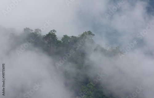 © Petch A Ratana, Obraz premium A white mist rises above the treetops on the mountain after the rain has stopped.