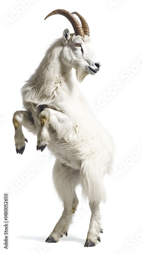 © Reyhan, Fototapeta premium A white mountain goat in a dynamic, leaping pose against a pure white background.