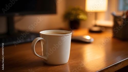 Fototapeta premium A white mug filled with coffee rests on a wooden desk illuminated by warm...