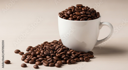 Fototapeta premium A white mug overflowing with roasted coffee beans and a small pile of beans...