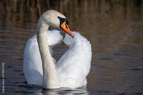 © Mariia, Naklejka premium A white mute swan swims in the water with a reflection toward the camera lens on a sunny spring evening. A mute swan (Cygnus color) with wholly white plumage. The mute swan close-up portrait.