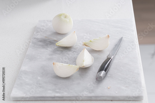 Fototapeta premium A white onion cut into quarters. A knife lies nearby