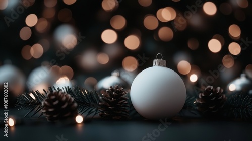 © CYBERPINK, Fototapeta premium A white ornament sits on a black background with a few pine cones