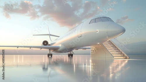 © Yusif, Obraz premium A white passenger airliner with a stairway, isolated against a bright sky background.