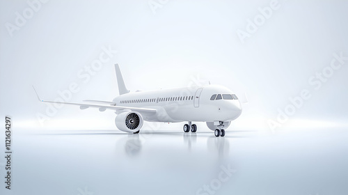 © NOORN, Fototapeta premium A white passenger jet with boarding stairs is isolated against a sky-filled, bright background.