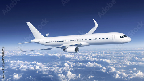 © sema_srinouljan, Obraz premium A white plane flies in a blue sky with clouds.