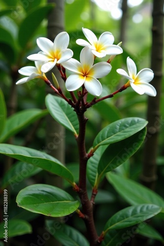 © chaiwat, Fototapeta premium A white plumeria tree in a lush garden with other tropical plants, blossoms, leafy