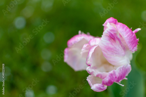 © FFilo, Fototapeta premium A white-purple blooming tulip flower on a blurred green background.