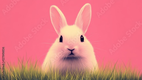 © DSimage, Obraz premium A white rabbit rests peacefully on green grass, set against a soft pink background, creating a serene and charming scene.