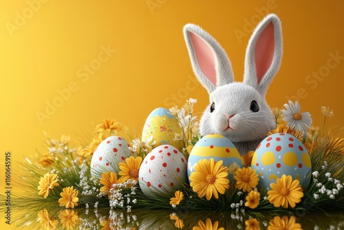 © Vii, Obraz premium A white rabbit sits next to a collection of decorated eggs, possibly for Easter or a spring celebration