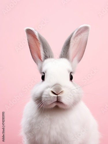 © pham, Fototapeta premium A white rabbit with grey ears is sitting in front of a pink background.