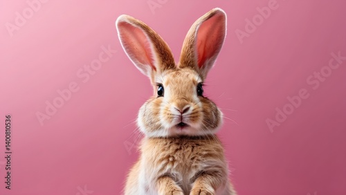© MST, Obraz premium A white rabbit with large ears and wide, expressive eyes is pictured against a pink background.