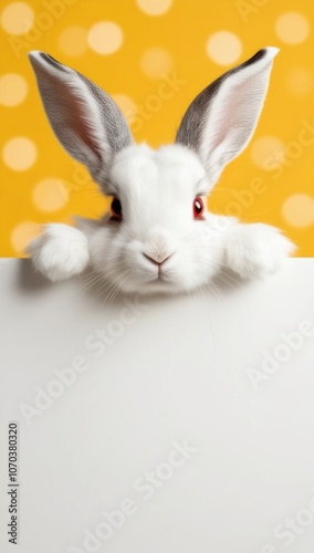 © MMM, Obraz premium A white rabbit with large ears over a blank copy space white sign, set against a vibrant yellow bokeh background. Easter template background