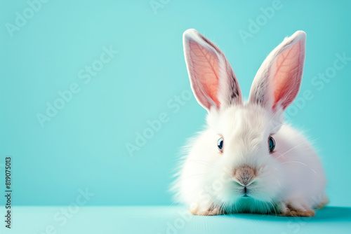 Fototapeta premium A white rabbit with long ears sitting on a blue surface