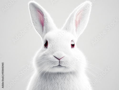 © Sergey, Obraz premium A white rabbit with pink ears is isolated on a transparent background. The rabbit has a soft, fluffy appearance and a calm expression.