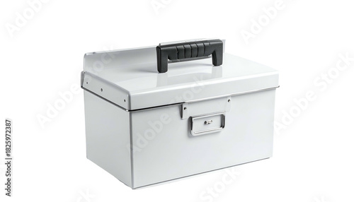 Fototapeta premium A white, rectangular container with a black handle, latch and rivets,...
