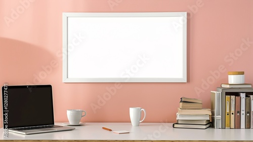 © M Anjum, Obraz premium A white rectangular frame above a desk in a home office, surrounded by a cup, a laptop, and a pile of books. HD 8K mockup wallpaper Photographic Image