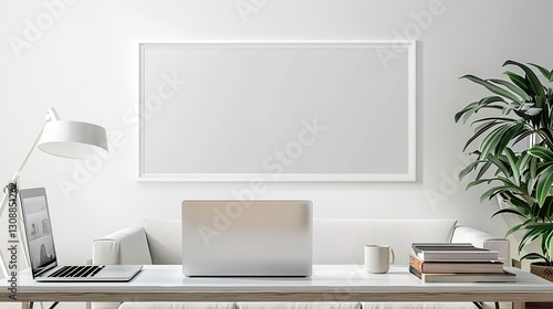 © M Anjum, Obraz premium A white rectangular frame above a living room coffee table, with a laptop, a cup, and a few books scattered. HD 8K white mockup wallpaper Photographic Image