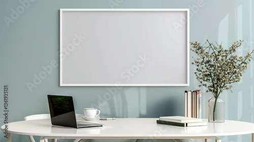 Obraz premium A white rectangular frame displayed above a small dining table with a cup of coffee, a laptop, and books. HD 8K mockup wallpaper Photographic Image