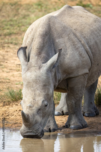 © Shirley and Johan, Fototapeta premium A White Rhino drinking at a waterhole in a game reserve in Africa