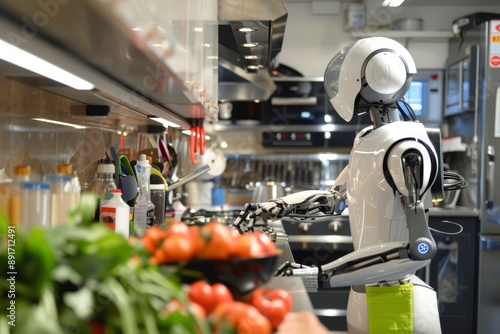 © happy_finch, Fototapeta premium A white robot assistant works in a modern kitchen, preparing food