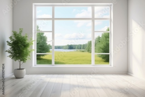 © YOUR, Obraz premium A White Room with a Large Window Looking Out to a Field and Lake